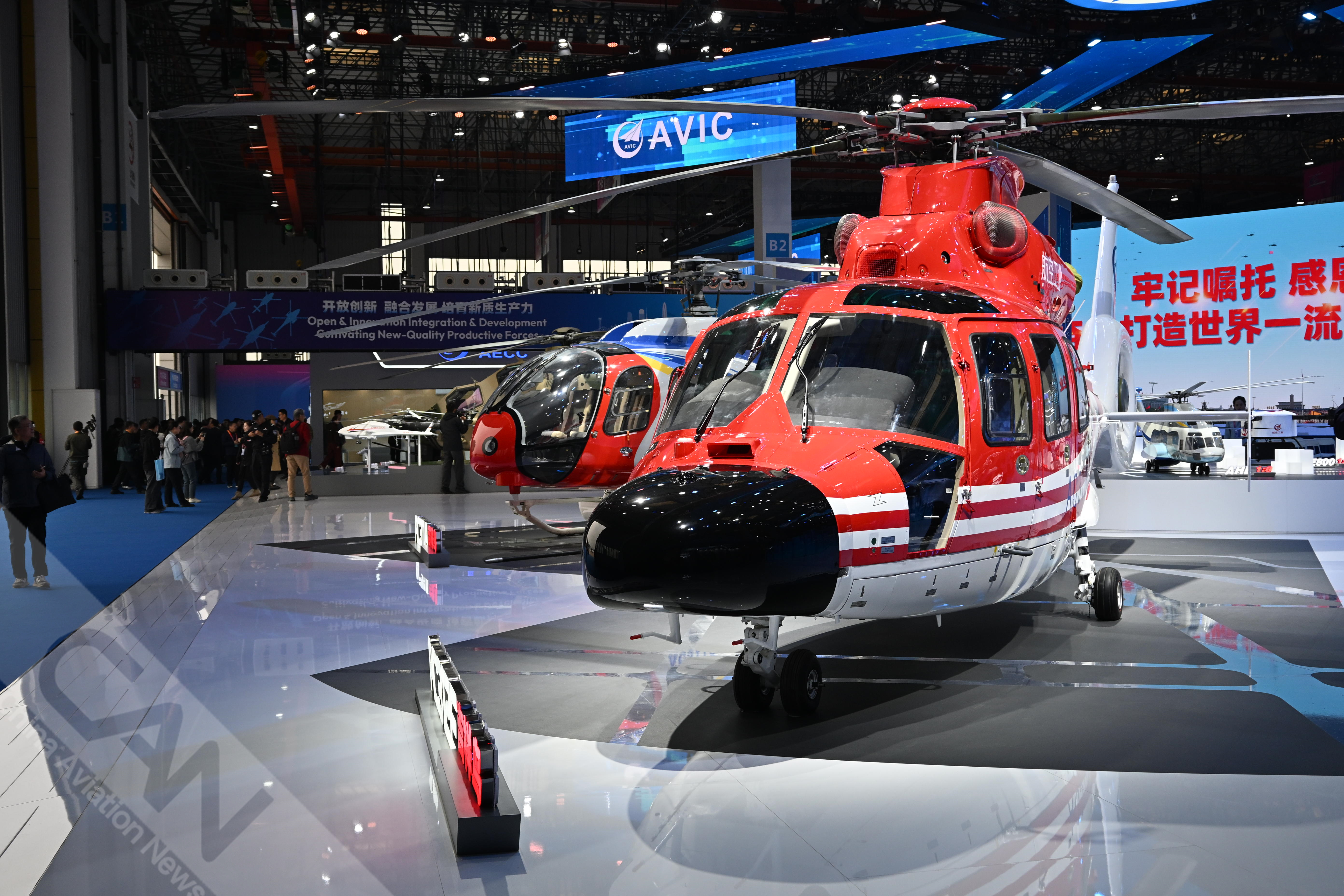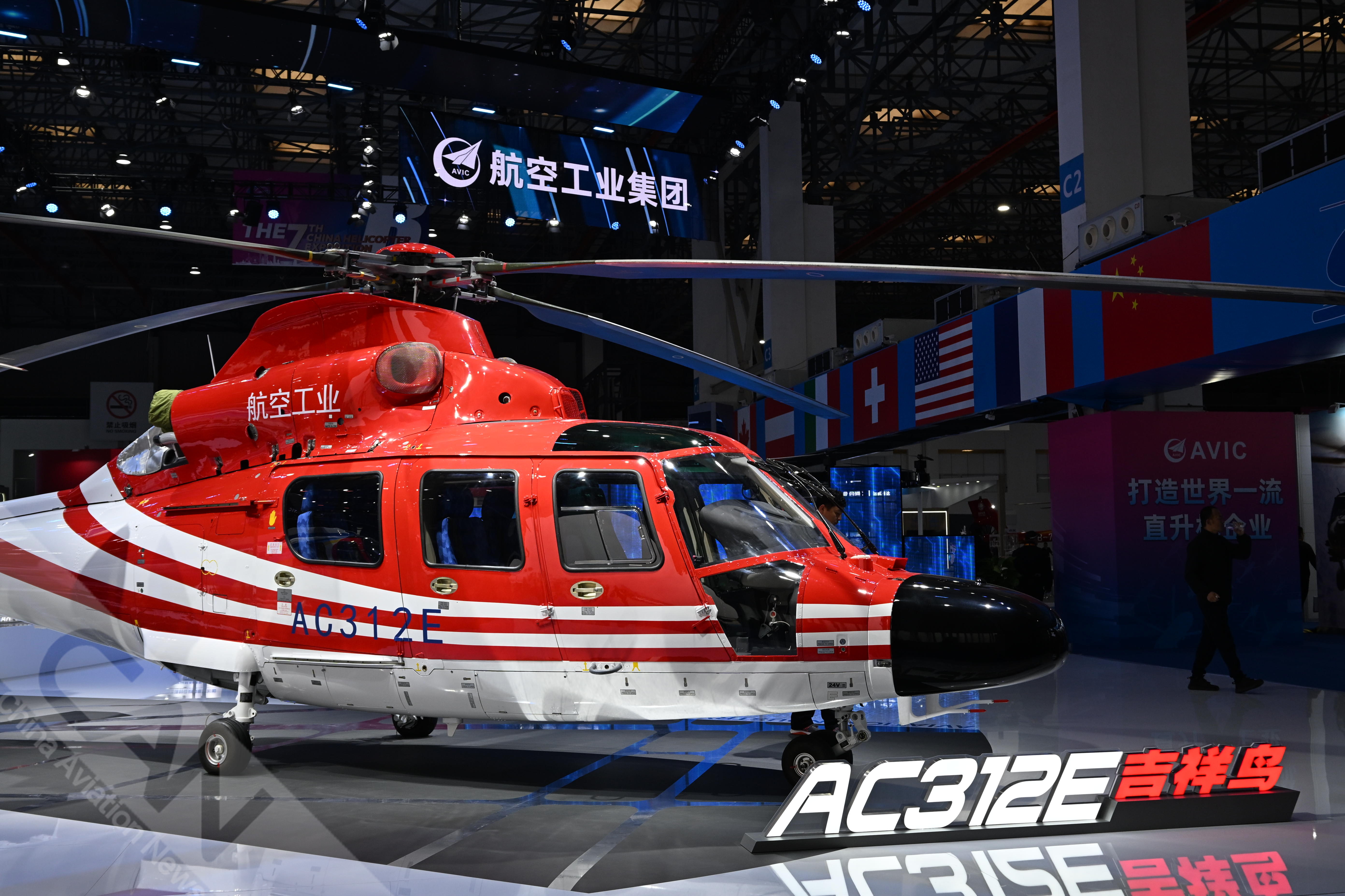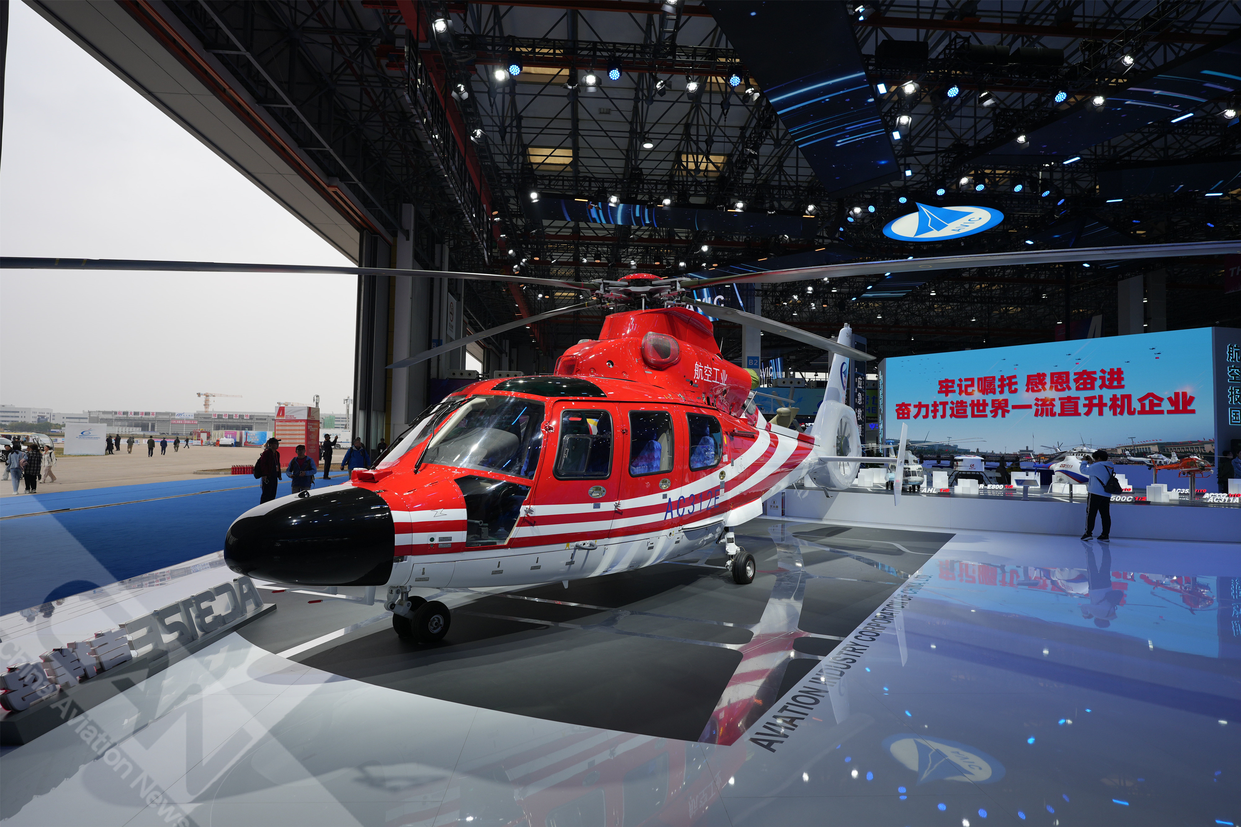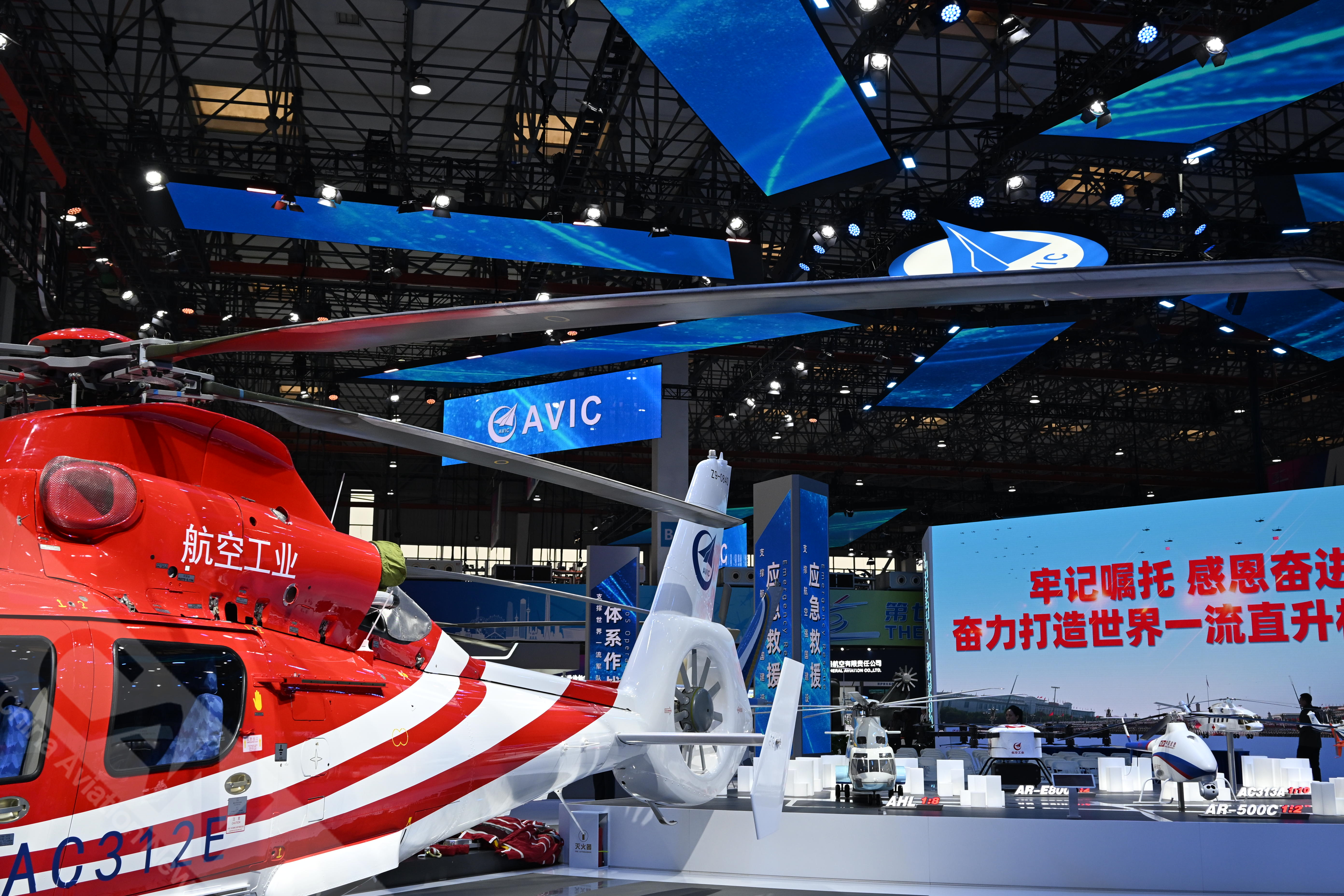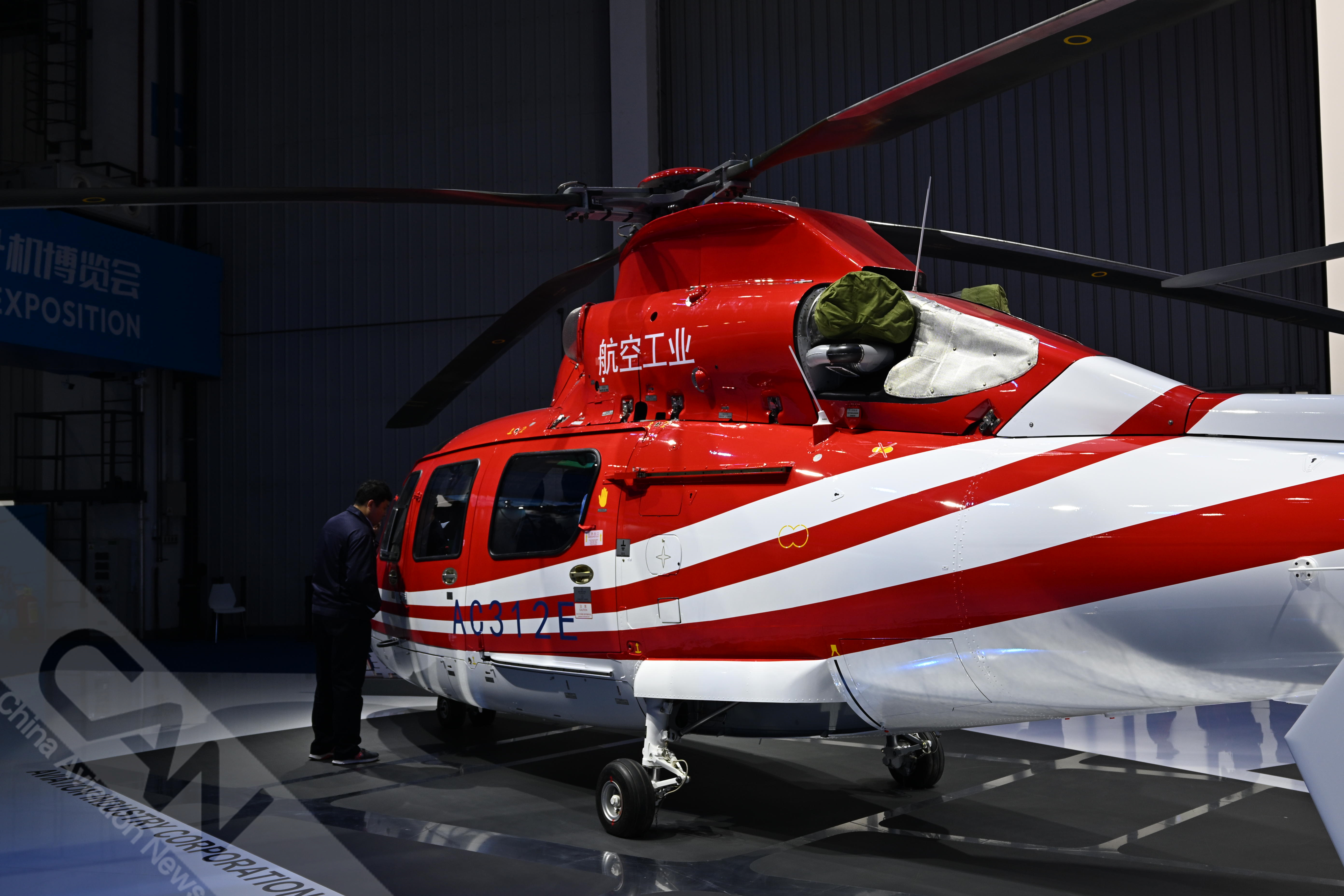 AC312E亮相第七届天津直博会室内展馆。AC312E是亚搏电竞官方网站(中国)股份有限公司集团响应国家通航产业发展研制的双发多用途直升机。摄影:吴紫磨